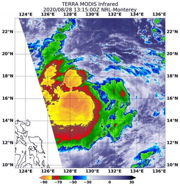 On Aug. 28 at 9:15 a.m. EDT (1315 UTC), the Moderate Resolution Imaging Spectroradiometer (MODIS) instrument aboard NASA’s Terra satellite captured an infrared image of cloud top temperatures in Maysak that showed a quick burst of strength. MODIS found the powerful thunderstorms that developed were as cold as or colder than minus 80 degrees Fahrenheit (minus 62.2 degrees Celsius) near Maysak’s center. Surrounding that area were cloud top temperatures were as cold as minus 70 degrees Fahrenheit (minus 56.6. degrees Celsius). All of those areas were generating heavy rain. The storm also appeared somewhat elongated from west to east.