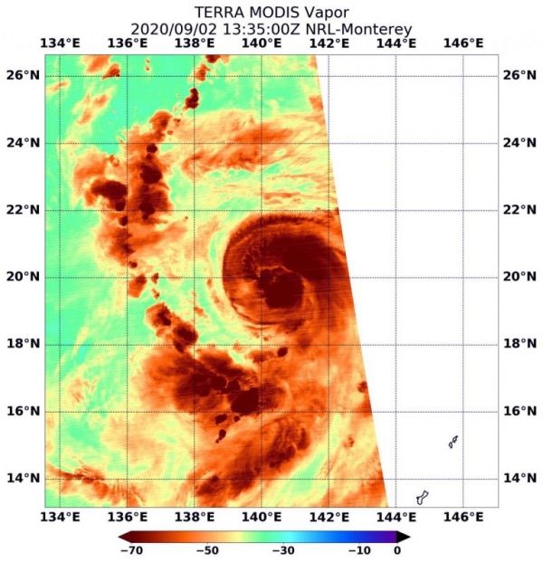 NASA’s Terra satellite passed over Haishen on Sept. 2 at 9:35 a.m. EDT (1335 UTC), and the Moderate Resolution Imaging Spectroradiometer or MODIS instrument gathered water vapor content and temperature information. The MODIS image showed highest concentrations of water vapor and coldest cloud top temperatures were around the center of circulation and in a large band of thunderstorms in the northeastern quadrant of the storm.