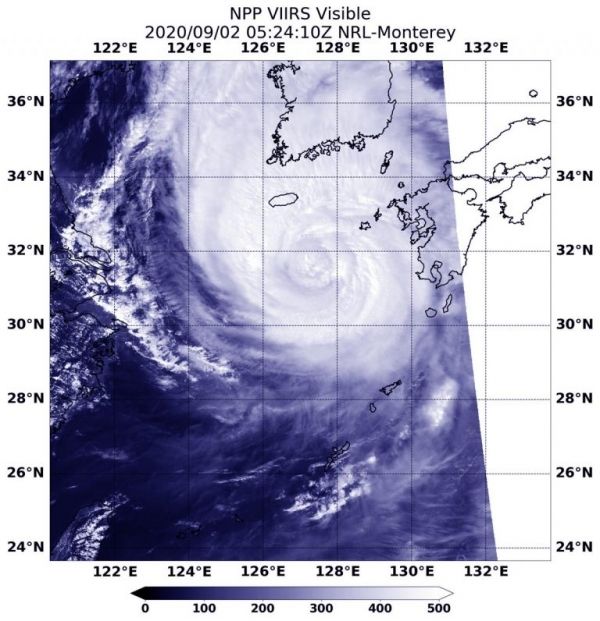 The Visible Infrared Imaging Radiometer Suite (VIIRS) instrument aboard Suomi NPP provided a visible image of Typhoon Maysak on Sept. 2 at 1:24 a.m. EDT (0524 UTC) and saw Typhoon Maysak headed for landfall in southern South Korea. The image revealed that the eye had again become obscured, and strong thunderstorms circled the center of circulation. The northern quadrant was already moving over South Korea and the eastern quadrant was brushing Kyushu, Japan. Kyushu is the most southern and third largest island of Japan’s five main islands.