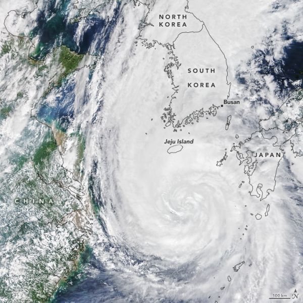 Shortly before landfall, in the early hours of September 3, the U.S. Joint Typhoon Warning Center reported sustained winds of 170 kilometers (105 miles) per hour as the eye of the storm was southwest of Busan, South Korea’s second-largest city and the world’s fifth-largest port. It is believed to be just the sixth typhoon of category 2 strength or higher to hit the Korean Peninsula since 1951.