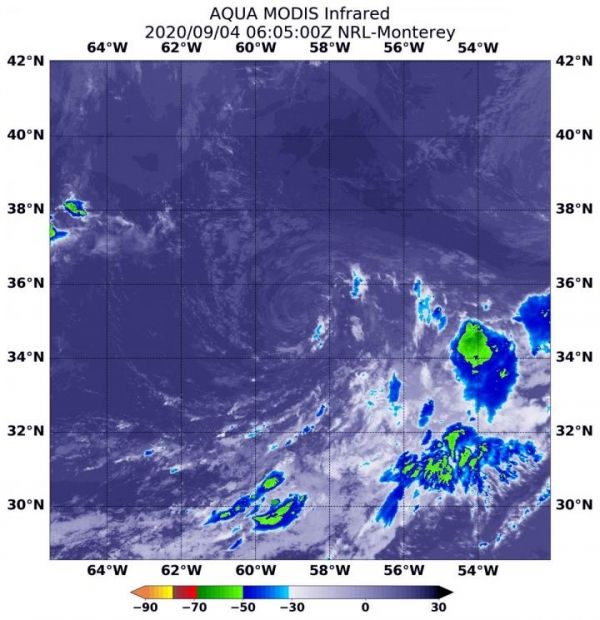 On Sept. 4 at 2:05 a.m. EDT (0605 UTC), the Moderate Resolution Imaging Spectroradiometer or MODIS instrument that flies aboard NASA’s Aqua satellite gathered infrared data on Omar that confirmed wind shear was still adversely affecting the storm. The center of circulation appears to be a swirl of clouds devoid of precipitation. In addition, satellite data reveals that some dry air is also being drawn into the circulation, which is further inhibiting the development of thunderstorms.
