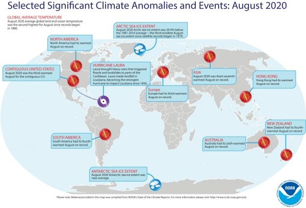 It’s been a remarkably steamy, record-setting last three months for Mother Earth. Not only was August 2020 the second-warmest August on record, but the Northern Hemisphere had its warmest summer, and the globe as a whole had its third-hottest three-month season, too. Here are highlights from NOAA’s latest monthly global climate report: