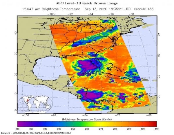 On Sept. 13 at 2:35 p.m. EDT (1835 UTC) NASA’s Aqua satellite analyzed Tropical Storm Sally using the Atmospheric Infrared Sounder or AIRS instrument. AIRS found coldest cloud top temperatures as cold as or colder than minus 63 degrees Fahrenheit (minus 53 degrees Celsius) around the center and east of the center. NASA research has shown that cloud top temperatures that cold indicate strong storms that have the capability to create heavy rain.