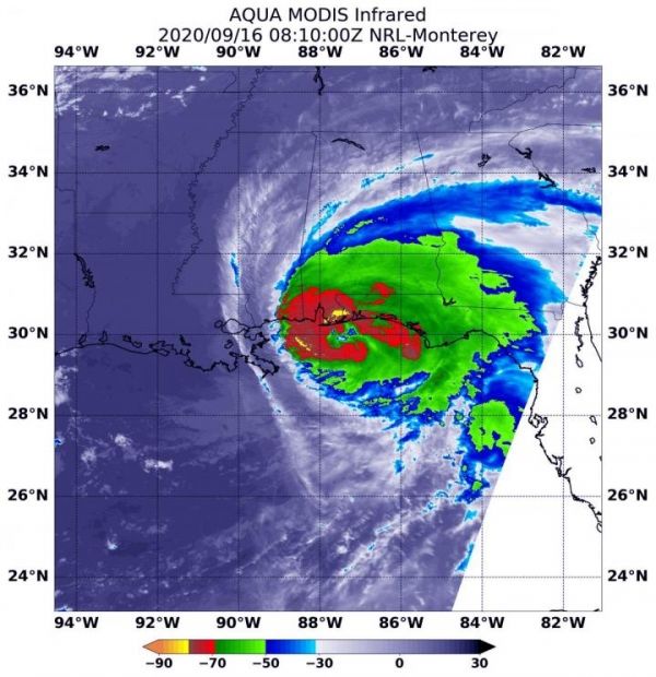 NASA’s Aqua satellite and the NASA-NOAA Suomi NPP satellite provided views of the strength, extent and rainfall potential as Hurricane Sally was making landfall during the morning hours of Sept. 16.