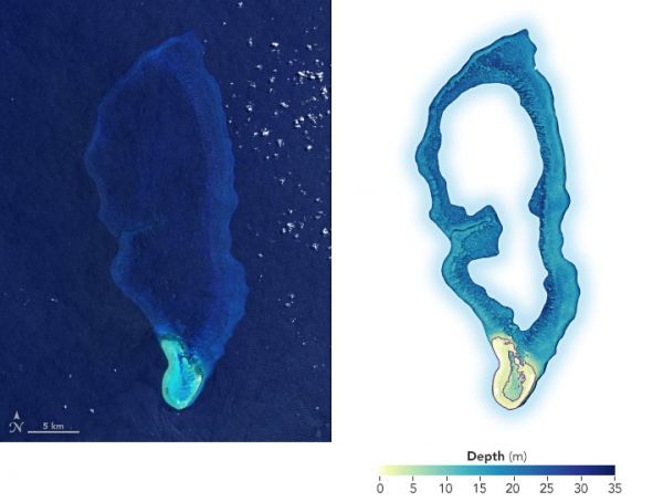 The images above show Velasco Reef in the Republic of Palau. The left, natural-color image of the South Pacific reef was acquired by Landsat 8 in 2020; the right image is a digital elevation model created with ICESat-2 data. The map was developed as part of a demonstration study led by remote sensing scientists Lori Magruder of the University of Texas at Austin and Chris Parrish of Oregon State University. They partnered with the Coral Reef Research Foundation in Palau to fuse existing sonar data with their ICESat-2 dataset.