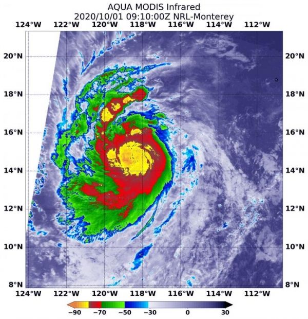 On Oct. 1 at 4:10 a.m. EDT (0910 UTC) NASA’s Aqua satellite analyzed the storm using the Moderate Resolution Imaging Spectroradiometer or MODIS instrument. Hurricane Marie’s cloud top temperatures and found strongest storms were around Marie’s center of circulation. Temperatures in those areas were as cold as minus 80 degrees Fahrenheit (minus 62.2 Celsius). Strong storms with cloud top temperatures as cold as minus 70 degrees Fahrenheit (minus 56.6. degrees Celsius) surrounded the center.