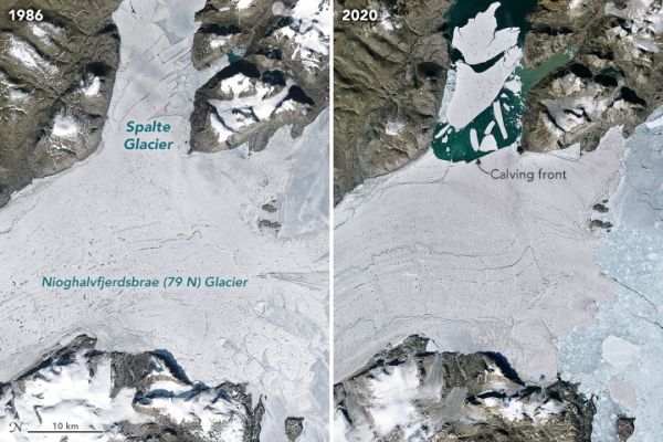Scientists have been watching Spalte Glacier crack, shed ice, and retreat for decades. But the loss of 113 square kilometers (44 square miles) of ice in summer 2020 means that the branch of floating ice on the northeast side of 79 N is essentially gone for good. Scientists say the recent loss of Spalte, and the subtler changes to the adjacent 79 N, are part of a “progressive disintegration” that has happened amid unusually warm temperatures in recent years.