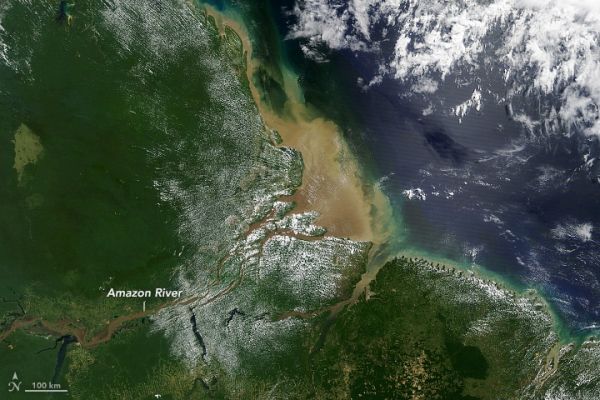 Every day, some 1.3 million tons of sediment pour from the mouth of the Amazon River into the Atlantic Ocean. The abundance of sediment—bits of rocks, soil, and clay carried by currents or resting on the bottom—is what gives much of the main stem of the Amazon River its milky brown color. The natural-color image above highlights the Amazon delta and estuary as it was observed by the Moderate Resolution Imaging Spectroradiometer (MODIS) on NASA’s Terra satellite on July 29, 2020.