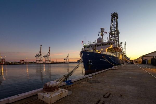The research vessel JOIDES Resolution in Fremantle (Australia) the morning before the ship sailed on Expedition 356. The results are based on samples taken from this drilling vessel as part of the International Ocean Discovery Program IODP. (Photo Credit: The research vessel JOIDES Resolution in Fremantle (Australia) the morning before the ship sailed on Expedition 356. The results are based on samples taken from this drilling vessel as part of the International Ocean Discovery Program IODP.)