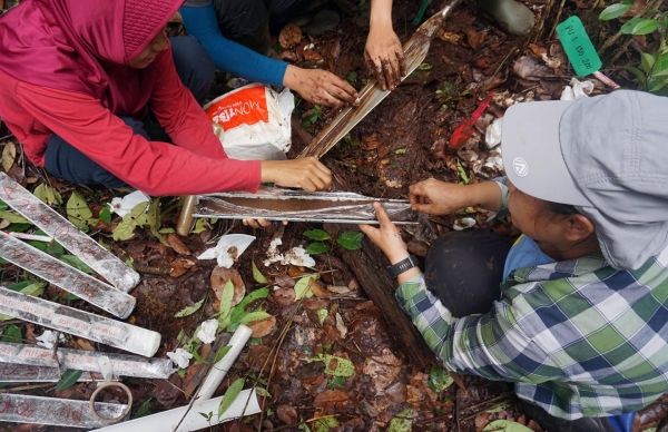 University of Oregon doctoral student Monika Ruwaimana, right, collects peat core samples with team members at a site on Borneo. The team's study, published in Environmental Research Letters, resets the dating of what may the world's oldest peatlands and provides an archive of new data on climate changes in the tropical peat. (Photo Credit: Dan Gavin)