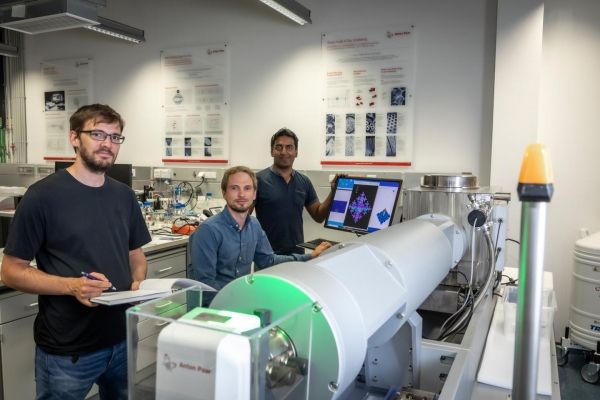 Harald Fitzek, Christian Prehal and Qamar Abbas (from left) at the SAXS facility SAXSpoint 2.0 (Anton Paar GmbH): With their work at Graz University of Technology, the researchers are providing new insights into hybrid supercapacitors. (Photo Credit: © Lunghammer - TU Graz)