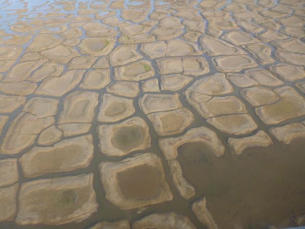 Unique landforms in an area of permafrost are the result of ice accumulating in the soil over a period of thousands of years. These landforms are sensitive to global warming, as the ice they contain is located close to the surface of the ground. As the area of summer thaw expands, the landforms collapse and slowly vanish from the landscape.