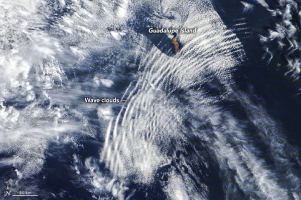 When the Moderate Resolution Imaging Spectroradiometer (MODIS) on NASA’s Terra satellite captured this natural-color image on October 4, 2020, a series of undulating cloud bands—an undular bore—rippled over the Pacific Ocean near Baja California.