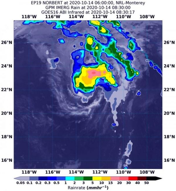 On Oct. 14 at 4:30 a.m. EDT (0830 UTC), NASA's IMERG estimated Tropical Storm Norbert was generating as much as 30 mm(1.18 inches of rain [dark pink]) near the center of circulation. Rainfall throughout most of the storm was occurring between 5 and 15 mm (0.2 to 0.6 inches/yellow and green colors) per hour. The rainfall data was overlaid on infrared imagery from NOAA's GOES-16 satellite. (Photo Credit: NASA/NOAA/NRL)