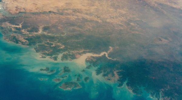 An astronaut aboard the International Space Station (ISS) took this oblique photograph that shows most of the West African country of Guinea-Bissau, along with neighboring Guinea, The Gambia and Senegal, and the southern part of Mauritania. This scene stretches from the green forest vegetation and wet climates of the Atlantic coast to the almost vegetation-less landscapes of the Sahara Desert. (Photo Credit: NASA)
