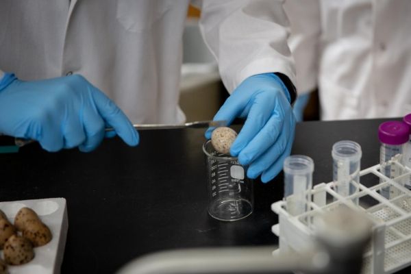 University at Buffalo researcher Steven Travis cracks an abandoned tern egg into a beaker. Though the new study published in Environment International focuses on common tern chicks, juveniles and adults, Travis and colleagues have begun work on a study examining the levels of pollutants in the eggs of common terns and other wild aquatic birds. (Photo Credit: Meredith Forrest Kulwicki / University at Buffalo)