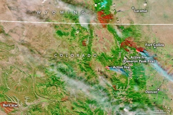 In northern Colorado, the Cameron Peak fire had consumed 206,000 acres (320 square miles) in the mountains west and northwest of Fort Collins and Estes Park by October 21, 2020. The fire ignited on August 13, and has burned through thick timber stands on rugged terrain in Arapaho and Roosevelt national forests. The natural-color and infrared images above were acquired on October 16, 2020 (the most recent clear view) by the Visible Infrared Imaging Radiometer Suite (VIIRS) on the Suomi NPP satellite.