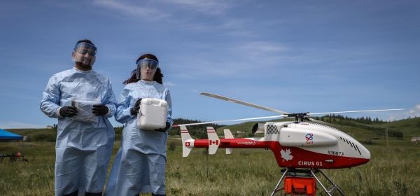 Unmanned Aerial Vehicles (UAV), commonly referred to as drones, may prove to be a valuable tool in the battle against pandemics like COVID-19. Researchers at the University of Calgary, the Southern Alberta Institute of Technology (SAIT), Alberta Health Services (AHS), and Alberta Precision Laboratories (APL) are partnering with the Stoney Nakoda Nations (SNN) to deliver medical equipment and test kits for COVID-19 to remote areas, and to connect these communities to laboratories more quickly using these remotely piloted aircraft.