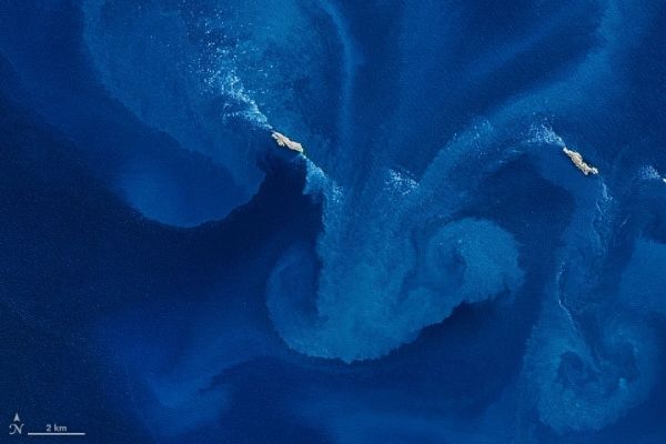 These natural-color images were acquired by the Operational Land Imager (OLI) on the Landsat 8 satellite on October 18, 2020. Swirls of milky blue water indicate the presence of substantial numbers of phytoplankton around the western Jason Islands, an archipelago off of West Falkland Island. The floating, plant-like organisms get piled up along the edges of currents and eddies, making visible some of the turbulent, dynamic ocean mixing patterns.