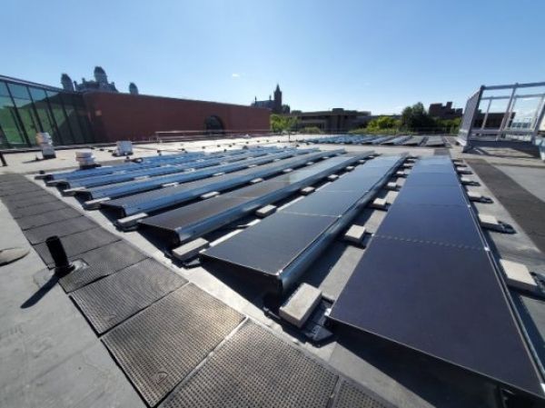 The project was designed by the Campus Planning, Design and Construction (CPDC) engineering team. After initial planning, the team from CPDC reviewed similar installations with staff members at SUNY College of Environmental Science and Forestry, which resulted in changes to the final layout of the panels and the panel support system.