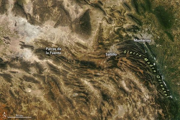 The image above shows the rugged folds and valleys of the Sierra Madre Oriental. The image was acquired on October 28, 2020, by the Moderate Resolution Imaging Spectroradiometer (MODIS) on NASA’s Aqua satellite. The mountain range runs adjacent to several large cities, including Monterrey (capital of Nueva León state) and Saltillo (capital of Coahuila state).