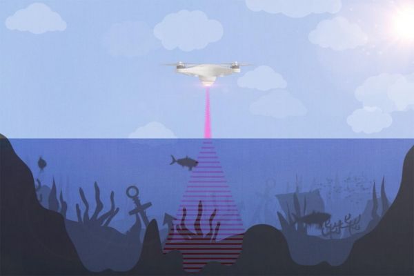Image: An artist's rendition of the photoacoustic airborne sonar system operating from a drone to sense and image underwater objects. (Credit: Kindea Labs)