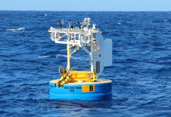 Off the coast of Hawaii, a Woods Hole Oceanographic Institution (WHOI) Hawaii Ocean Time-series Station buoy makes measurements of surface ocean pressure. (Photo Credit: Al Plueddemann, WHOI.)