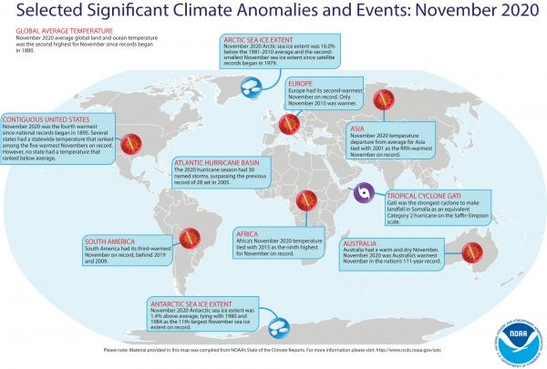 The average global land and ocean surface temperature for November 2020 was 1.75 degrees F (0.97 of a degree C) above the 20th-century average. This is the second-highest November temperature on record — slightly below that for November 2015 — and exceeds the now third-highest average temperature observed for November 2019.