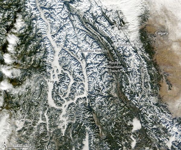 The Rockies stretch about 3,000 miles (4800 kilometers) across the western half of North America. This view shows a segment measuring about 400 miles (600 kilometers) long and spanning parts of two Canadian provinces (British Columbia and Alberta) and three U.S. states (Washington, Idaho, and Montana). The image above was acquired on December 3, 2020, with the Moderate Resolution Imaging Spectroradiometer (MODIS) on NASA’s Terra satellite.
