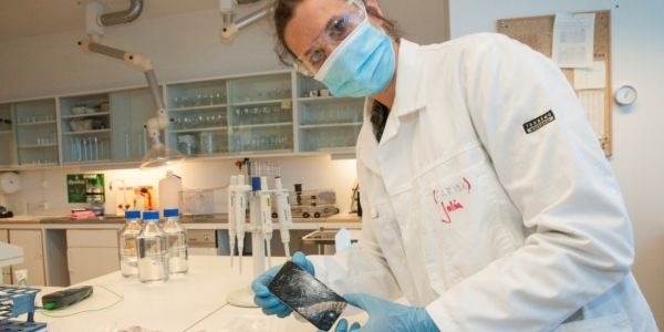 Image: Research Scientist Julia Farkas at SINTEF seen here testing whether mobile phones are leaking substances into seawater, and analysing the concentrations these substances are found in. The results will tell us something about how they impact on the environment. (Photo: Anne-Lise Aakervik)