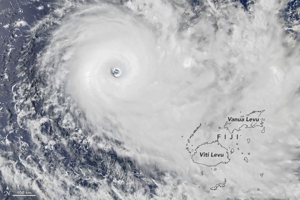 As of midnight Fiji standard time on December 17, the Joint Typhoon Warning Center reported sustained winds of 140 knots (260 kilometers/160 miles per hour). The center of the category 5 storm was about 400 kilometers (240 miles) northwest of Suva, Fiji. The storm’s eye appeared to be headed between the islands of Viti Levu and Vanua Levu. Forecasters noted that wave heights around the eye of the storm could approach 14 meters (45 feet).