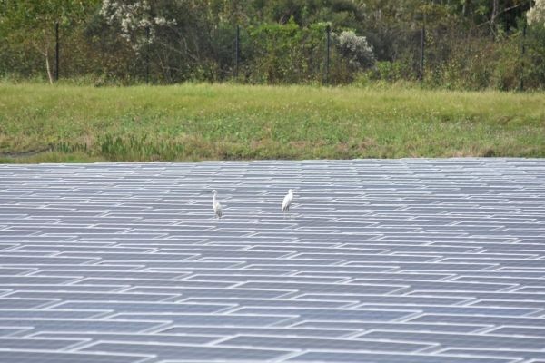 Great egrets sit atop a floatovoltaic array in Florida in 2020. (Photo Credit: Rebecca R. Hernandez, UC Davis)