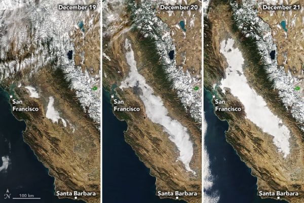 As winter moisture rolls in from the Pacific Ocean and makes snow on the Sierra Nevada range, it also can create blankets of white across the Central Valley below. Known as Tule (too-lee), this opaque fog spread across California in time for the 2020 winter solstice. Though it can look pretty from above, the dense fog can be hazardous for people on the ground.