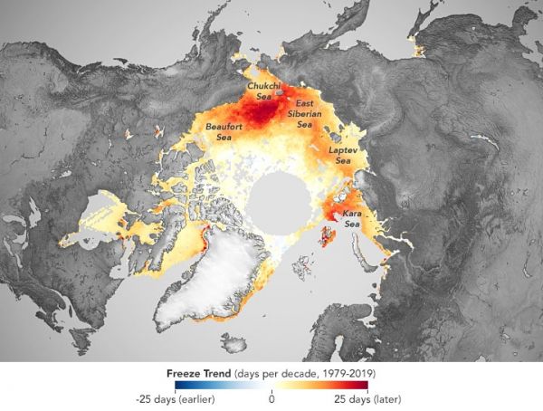 Throughout 2020, the Arctic Ocean and surrounding seas endured several notable weather and climate events. In spring, a persistent heatwave over Siberia provoked the rapid melting of sea ice in the East Siberian and Laptev Seas. By the end of summer, Arctic Ocean ice cover melted back to the second-lowest minimum extent on record. In autumn, the annual freeze-up of sea ice got off to a late and sluggish start.