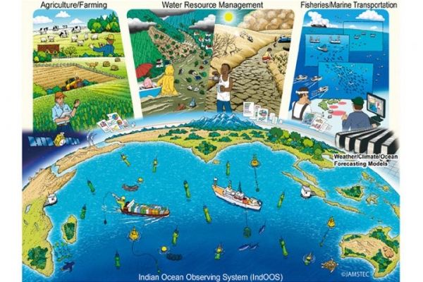 Images: Artist's illustration of the Indian Ocean Observing System and its societal applications. IndOOS data support research to advance scientific knowledge about the Indian Ocean circulation, climate variability and change, and biogeochemistry, as well as societal applications due to its contribution to operational analyses and forecasts. Citation: Bulletin of the American Meteorological Society 101, 11; 10.1175/BAMS-D-19-0209.1 (Credit: JAMSTEC)