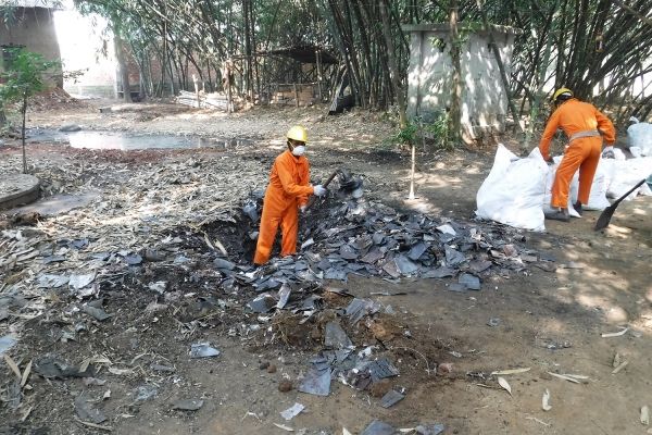 Image: Workers dig up contaminated soil and waste at the site of a former lead battery recycling operation in Kathgora, Bangladesh. (Image credit: Pure Earth)