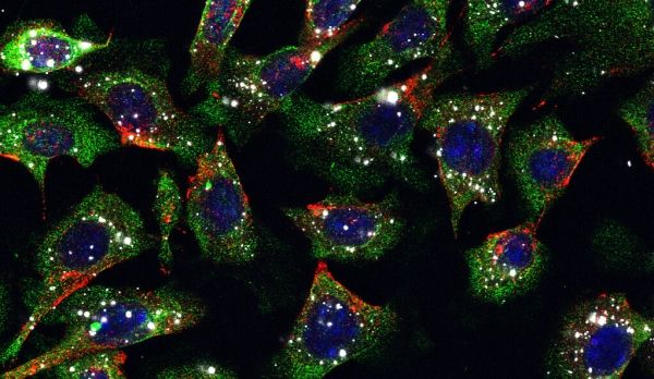 Bioadhesive nanoparticles (white) after being taken up by skin cancer tumor cells during in virtro culture. (Photo credit: Julia Lewis)