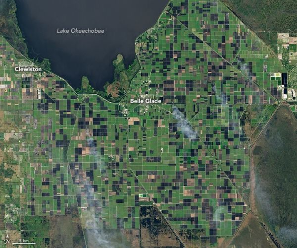 Between October and April each year, NASA satellites routinely observe smoke plumes rising from farmland south of Lake Okeechobee in Florida. Almost all of the plumes appear to come from fires on sugarcane farms. Sugar growers light the hot, fast-moving blazes to burn the leaves and tops off the plant, leaving the sweeter cane material intact—a practice that makes harvesting and transporting sugar cane cheaper. But the smoke has raised health concerns in some nearby communities.
