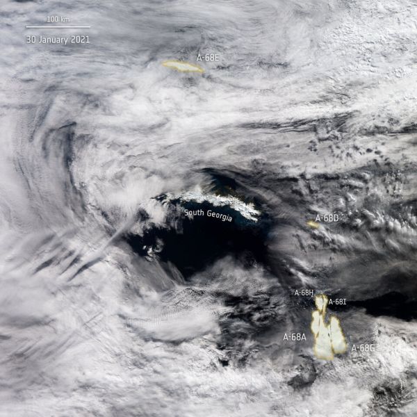 One of the largest icebergs of all time, A-68A broke off from the Larsen-C ice shelf in 2017 and has been closely monitored over recent months as it veered dangerously close to South Georgia in the South Atlantic.