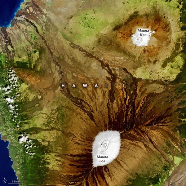 On February 6, 2021, the Operational Land Imager (OLI) on Landsat 8 acquired natural-color images of the “Big Island” of Hawai'i with abundant snow on its two tallest peaks. Nearly every year, Mauna Kea and Mauna Loa (elevation above 13,600 feet/4200 meters) receive at least a dusting that lasts a few days. Sometimes, like this year, it is more like a winter blanket of snow.