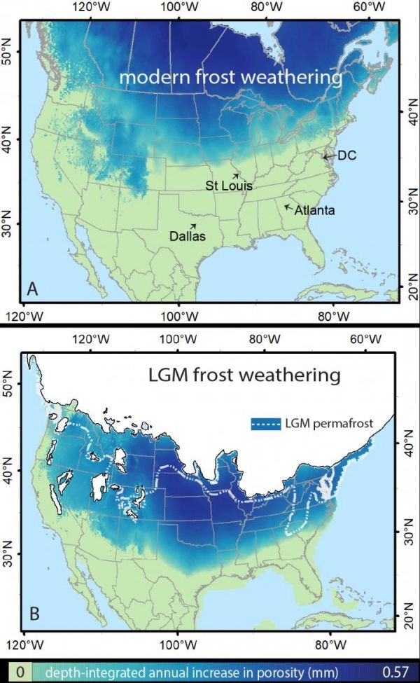 Image: The extent of frost cracking in modern North America and during the last glacial maximum (Credit: Jill A. Marshall)