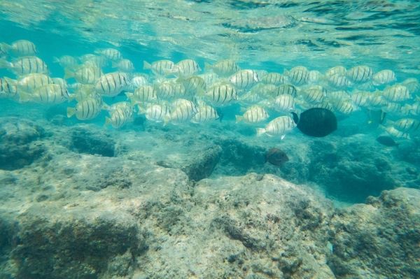 Image: A large school of surgeonfishes swims over a shallow Hawaiian reef. (Credit: Noam Altman-Kurosaki)