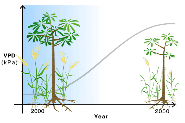 Atmospheric drying (referred to as water vapor pressure deficit or VPD) is expected to increase as a result of climate change. This could reduce crop yields and make trees shorter. (Photo Credit: Maria H Park).
