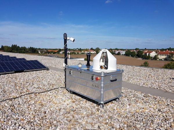 Measuring device of the MUCCnet sensor network set up by Prof. Jia Chen, Chair of Environmental Sensing and Modeling, at the TUM Department of Electrical and Computer Engineering of the Technical University of Munich (TUM) on the roof of a building in Taufkirchen. (Photo Credit: F. Dietrich / TUM)