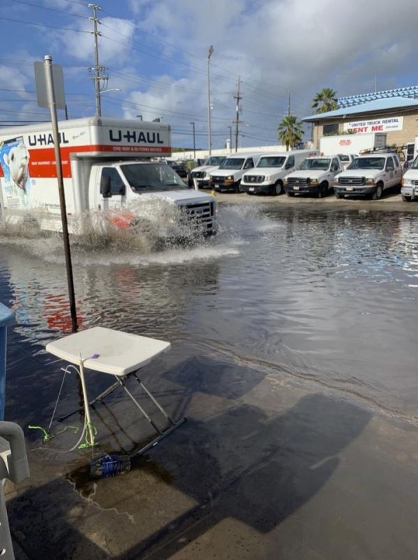 Image: High tide nuisance flooding in Māpunapuna is a hazard to vehicular and pedestrian traffic. (Credit: Trista McKenzie)