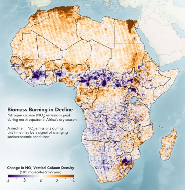 Researchers from the U.S., France, and Cote d'Ivoire analyzed satellite observations of air pollution from 2005 to 2017. They found that nitrogen dioxide (NO2) concentrations over the northern grassland region of sub-Saharan Africa dropped by 4.5 percent during the dry season (November through February).