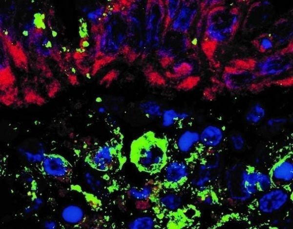 Image: Biopsied colon tissue infected by SARS-CoV-2 and stained by immunofluorescence for human protein ACE2 (red) and viral spike protein (green). Cell nuclei are stained blue (Credit: Institute of Biology and Gastrocenter/FCM-UNICAMP)