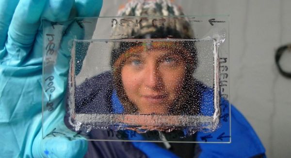 Image: The study's lead author Emilie Capron looks through a thin, polished piece of ice core from the NEEM ice core which was drilled through the Greenland ice cap. Ice cores consist of compressed snow, and a small amount of air is sealed in bubbles during the compression. Ice-core scientists reconstruct the composition of the atmosphere of the past by analysing these bubbles. (Photo: Sepp Kipfstuhl)