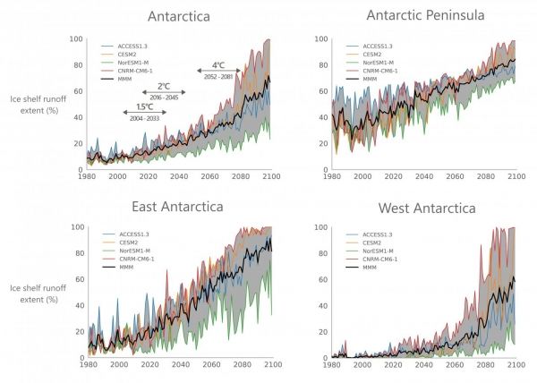 Projection of the area of Antarctic shelves that will experience excess surface meltwater. (Photo Credit: ULiège)