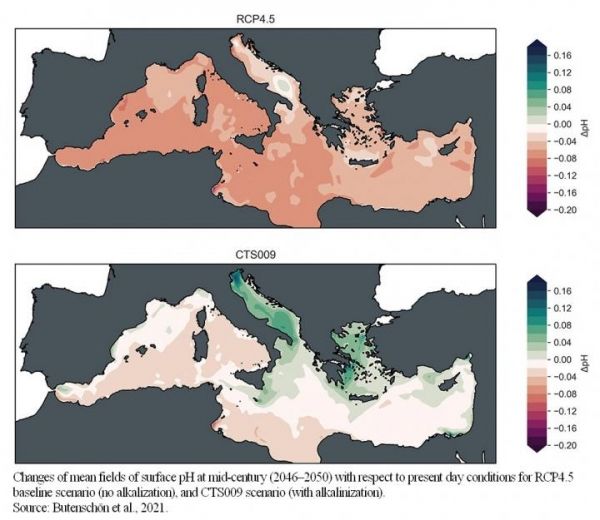 Changes of mean fields of surface pH at mid-century (2046-2050) with respect to present day conditions for RCP4.5 baseline scenario (no alkalinization), and CTS009 scenario (with alkalinization) (Photo Credit: Butenschön et al., 2021)